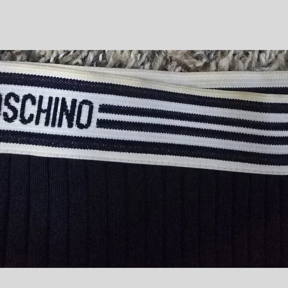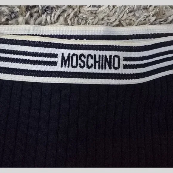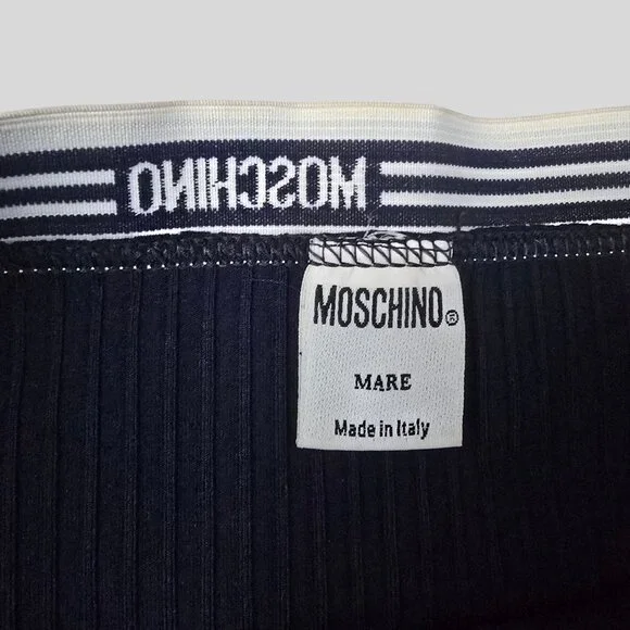 Rare Vintage Moschino Mare Ribbed Logo Mini Skirt Cover-Up – Navy Blue – IT 42Step into timeless Italian style with this rare and vintage Moschino Mare mini skirt. Originally designed as a swim cover-up, this elevated piece features ribbed navy blue fabric and the iconic MOSCHINO elastic logo waistband.Details:Authentic Moschino Mare – vintage and hard to findMade in ItalySize: IT 42 (approx. US Small)Ribbed stretch materialSignature logo waistbandApprox. Length: 13”Ideal as a swimsuit cover-up, beachwear, or stylish streetwear pieceCondition: Gently worn vintage condition. Please note: there is some tan discoloration on the waistband from makeup, as shown in photos. This does not affect wearability or stretch and is reflected in the price.This collector’s item is a perfect mix of sporty, luxe, and classic Moschino edge. Don’t miss the chance to own a piece from one of Moschino’s most coveted vintage lines.
